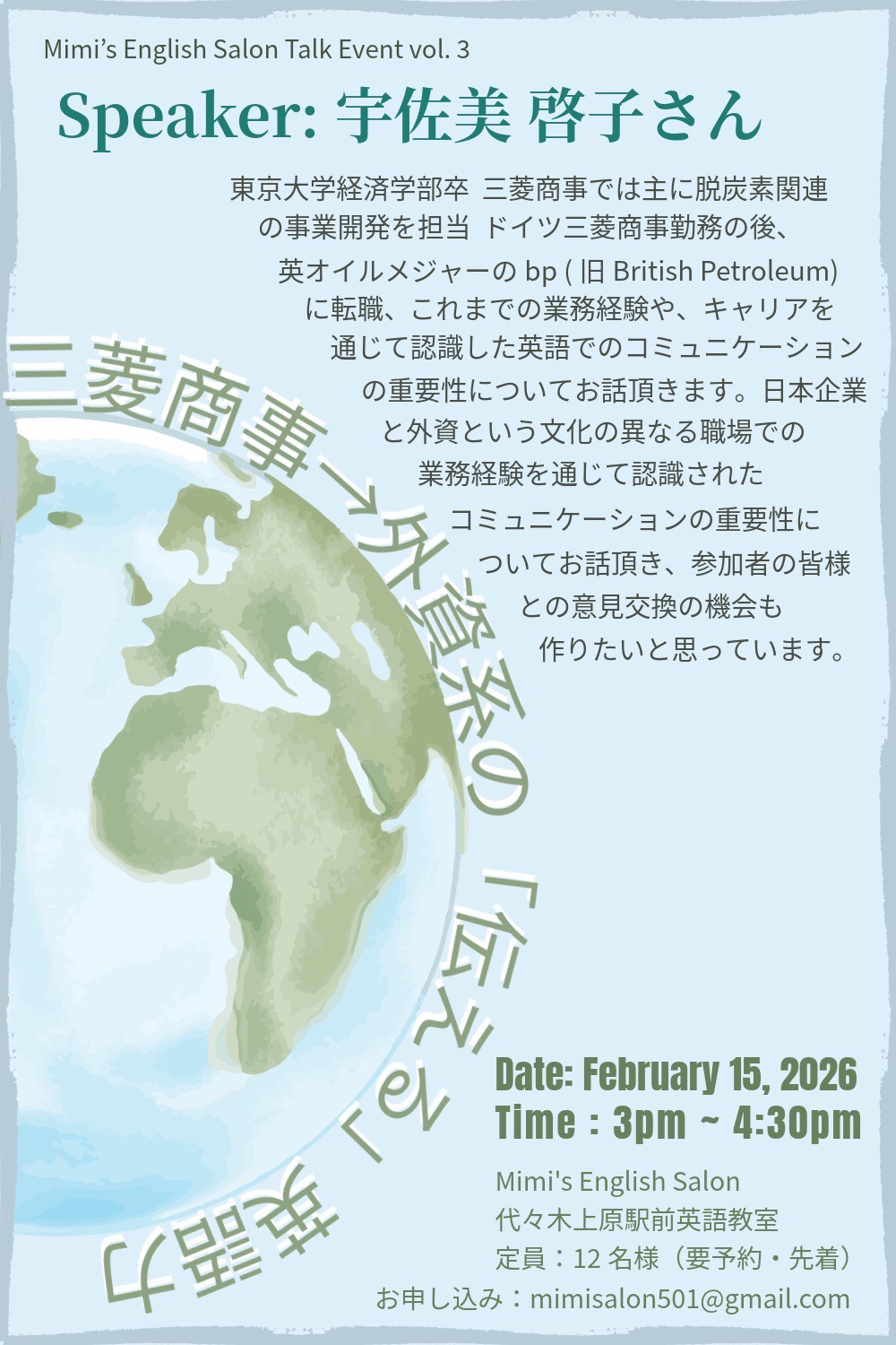 東京大学経済学部卒 三菱商事では主に脱炭素関連の事業開発を担当 ドイツ三菱商事勤務の後、英オイルメジャーのbp(旧 British Petroleum)に転職、これまでの業務経験や、キャリアを通じて認識した英語でのコミュニケーションの重要性についてお話頂きます。日本企業と外資という文化の異なる職場での業務経験を通じて認識されたコミュニケーションの重要性についてお話頂き、参加者の皆様との意見交換の機会も作りたいと思っています。